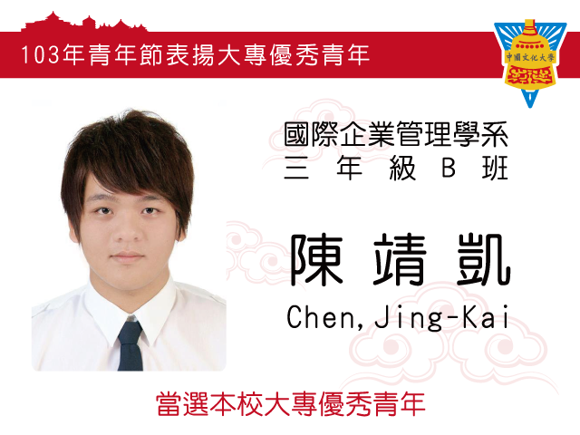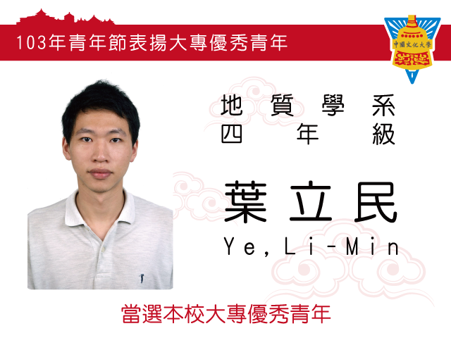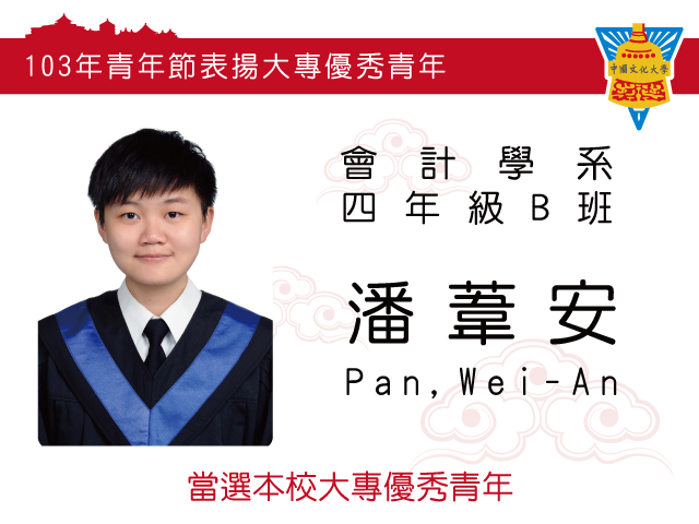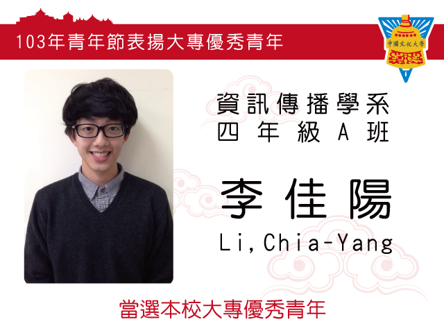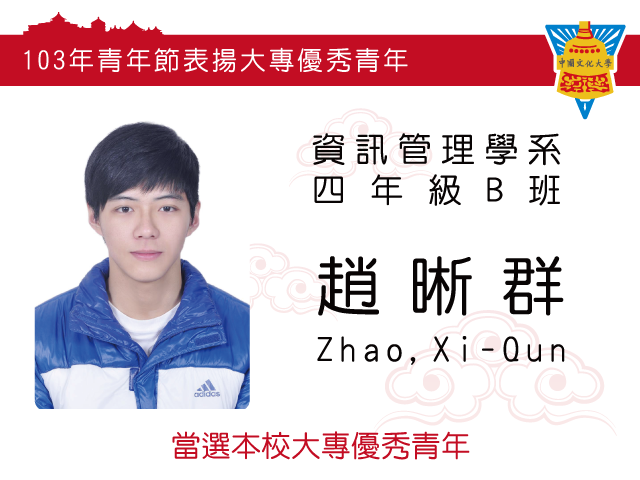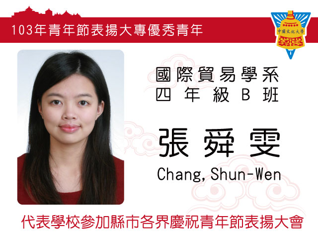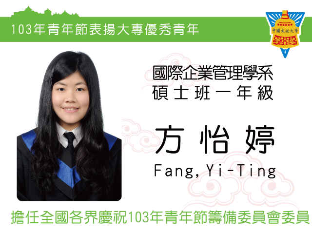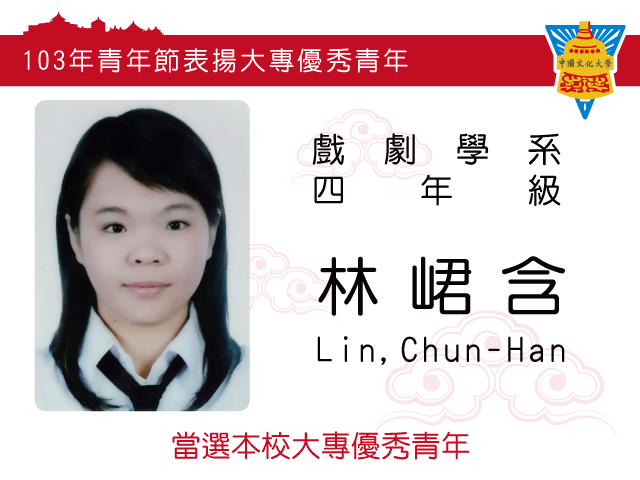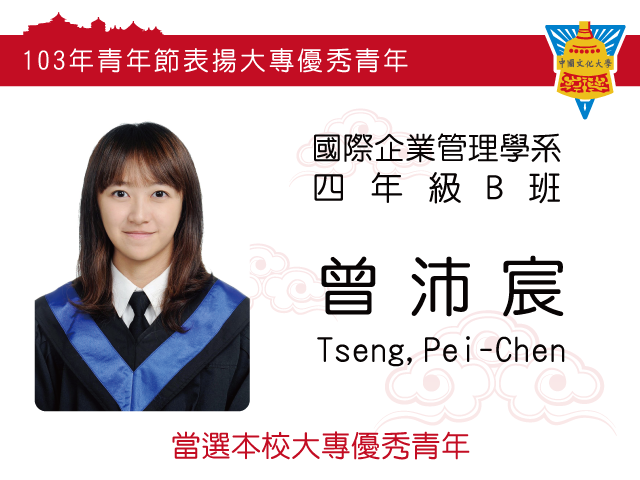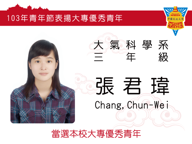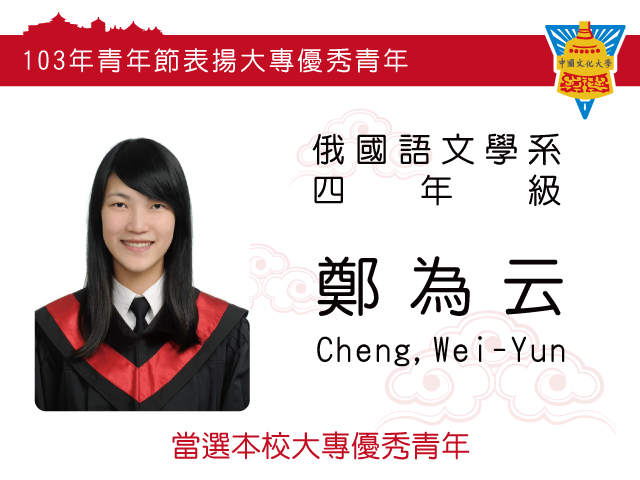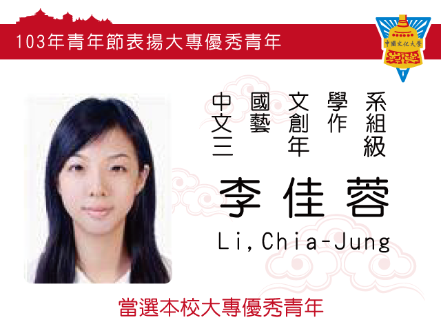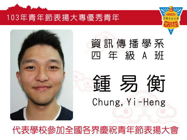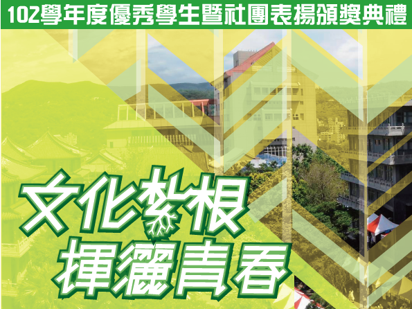 103年度本校13位大專優秀青年當選人 將於6月7日於柏英廳『優秀學生暨社團表揚頒獎典禮』由救國團代表進行頒證